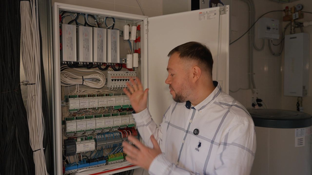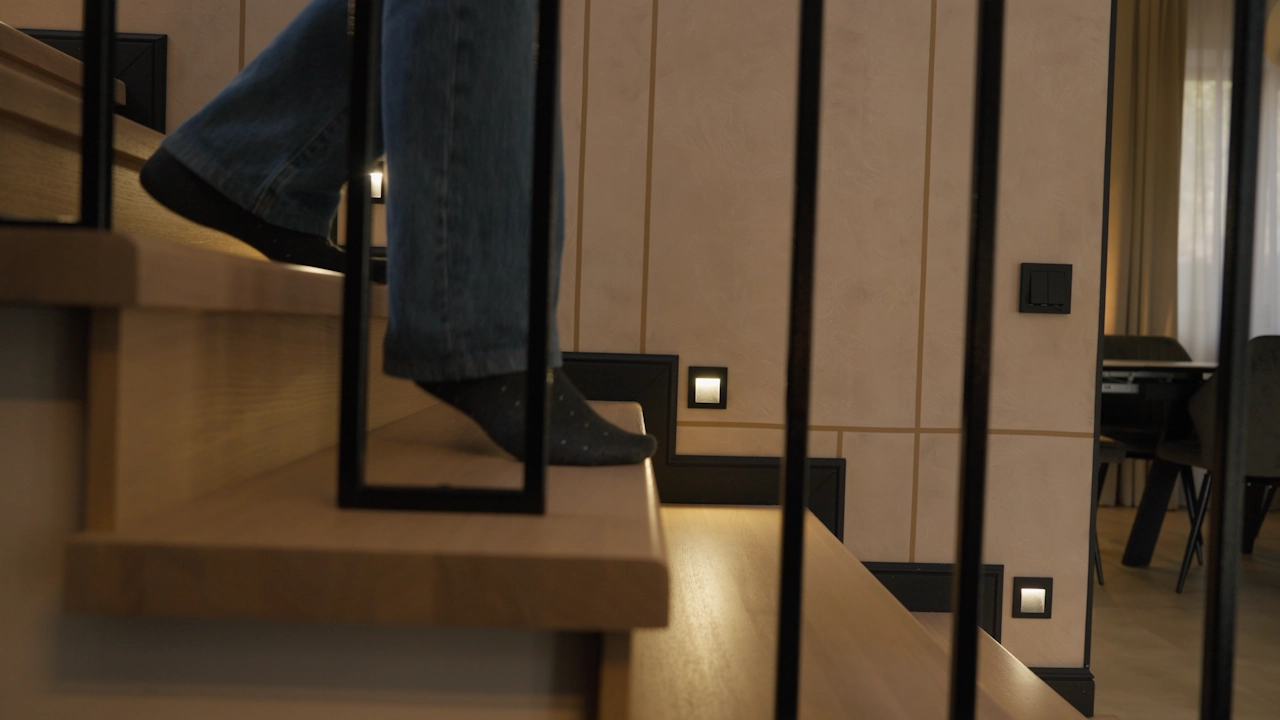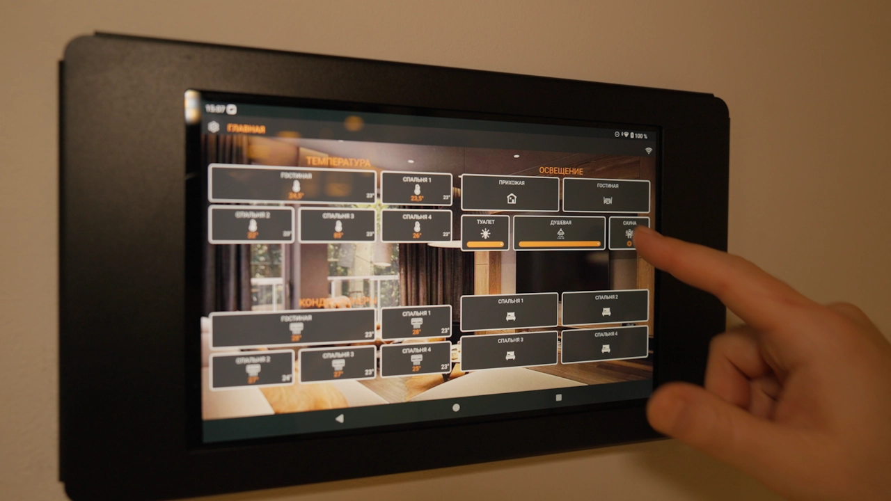 Уже с первых секунд пребывания умное освещение погружает в пространство комфорта и заботы о гостях. Свет включается автоматически при входе. А на лестнице, в коридорах и санузлах освещение срабатывает по движению, сопровождая гостей уютным светом без необходимости искать выключатели. В каждой комнате предусмотрено несколько уровней атмосферного освещения. Скажите «Алиса, включи мягкий свет» и комната преобразится в томное пространство. Вечером на террасе по астрономическому реле загорается красивая уличная подсветка. Всем светом можно управлять голосом, с планшета или привычными выключателями — интуитивно и легко.